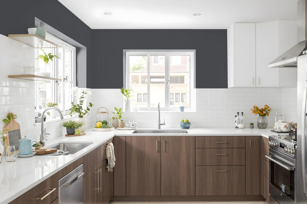 For a kitchen color scheme, Behr Night Club N500-7 creates a dramatic and sophisticated atmosphere. This dark hue offers a cozy, intimate feel while serving as a striking backdrop that can be effectively paired with lighter, neutral tones like beige or ivory on cabinets, countertops, or walls to balance its depth.