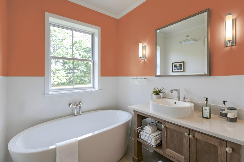 Behr Rusty Gate M200-7 is an excellent choice for bathroom color, offering a soft, velvety finish that remains attractive even in moderate-traffic settings. Its eggshell enamel finish effectively resists dirt, grime, and mildew, ensuring a lasting look in high-moisture areas where cleanliness is essential.