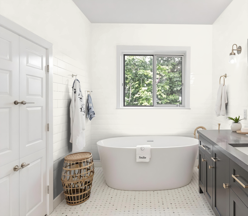 Benjamin Moore's Alabaster OC-129 is an excellent bathroom color choice, offering remarkable performance in humid settings. Part of a premium collection designed for high-moisture environments, it provides strong resistance against mold and mildew while delivering a luxurious matte finish that maintains its rich tone over time.