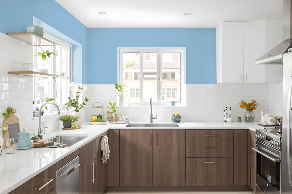 Incorporate Blue Bayou 801 on selected walls while contrasting with complementary hues on trim, cabinets, or countertops to achieve a cohesive design. Employing finishes with a subtle sheen ensures the kitchen remains durable and easy to maintain, making this color an excellent choice for both style and practicality.