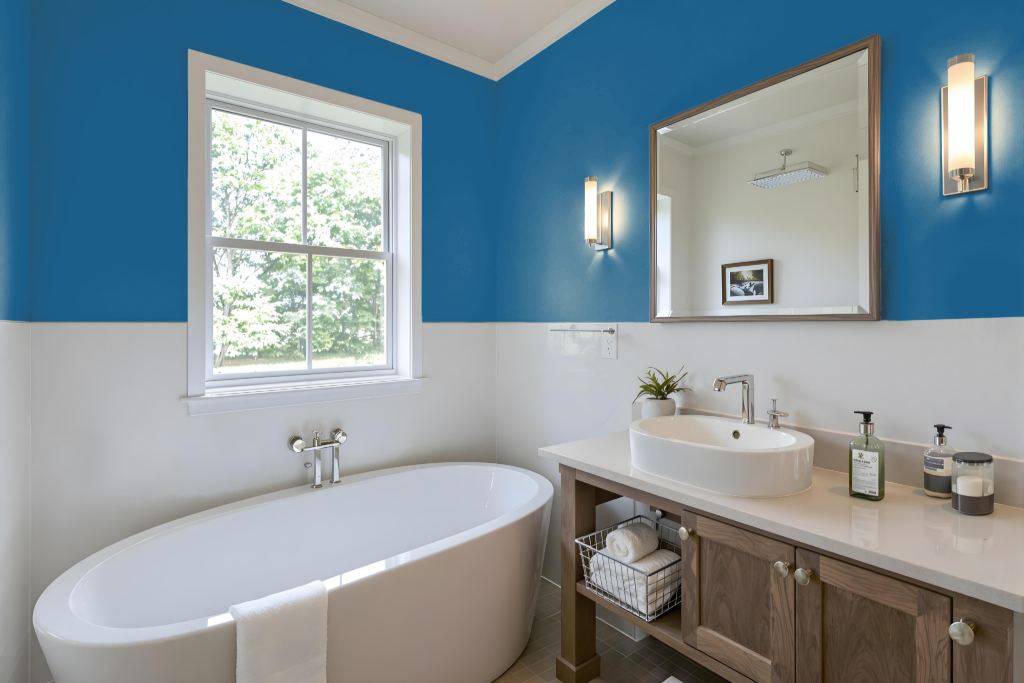 For a bathroom, Benjamin Moore Blueberry 2063-30 provides a striking aesthetic ideal for this space. The Aura Interior Paint, designed for high-humidity environments, offers superior coverage, fade resistance, and washability in any sheen. Finishes such as pearl or satin create a smooth, less porous surface that is easy to clean and resistant to mildew.