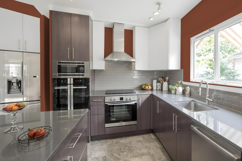 For a kitchen color scheme, Benjamin Moore's Burnt Cinnamon 2094-10 offers an inviting option that brings warmth and character to the heart of your home. When paired with neutral tones like White Sand (OC-10) or Mayonnaise (OC-85), the space exudes sophistication, creating an ideal backdrop for a welcoming culinary atmosphere.