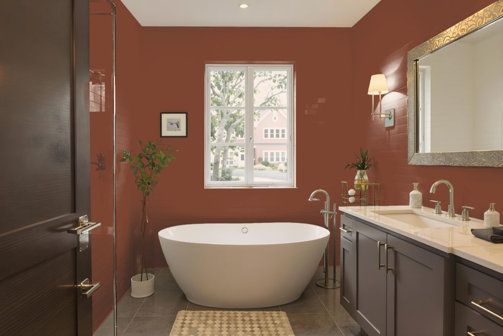 Benjamin Moore's Burnt Cinnamon 2094-10 is an excellent choice for bathroom paint, delivering durability in high-humidity areas. The formula integrates Bath & Spa technology and proprietary Color Lock features that help maintain vibrant, long-lasting color while resisting humidity, fading, and common bathroom challenges.