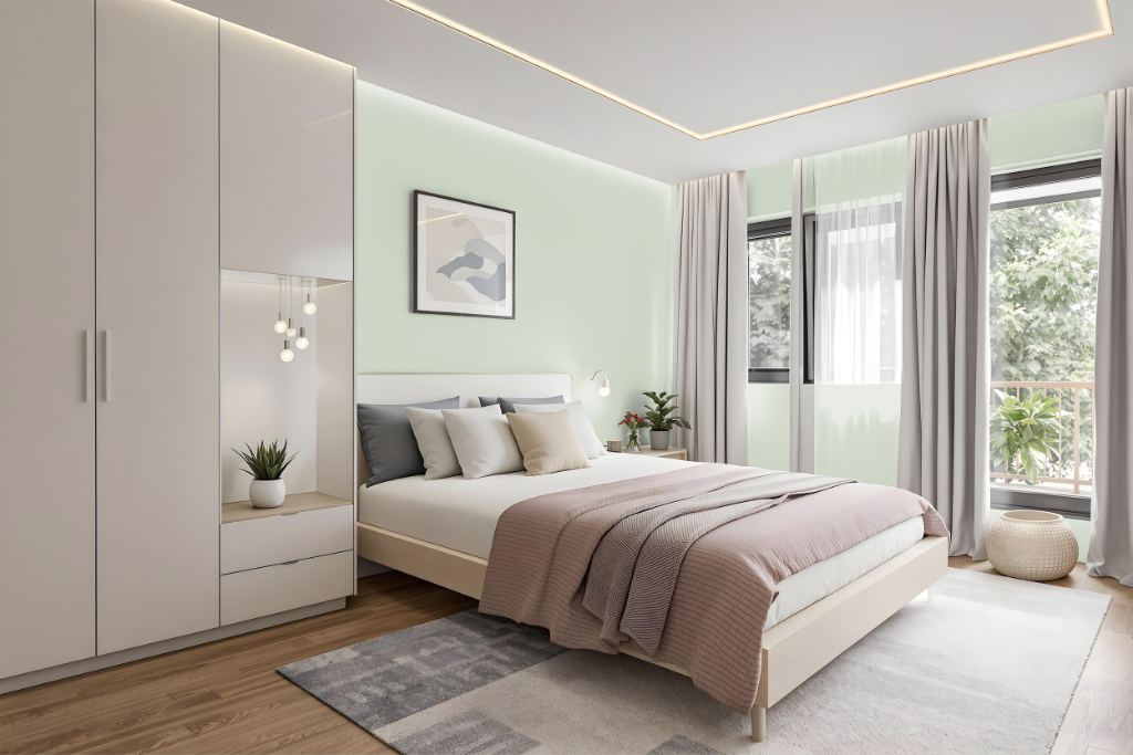 For a bedroom color scheme, Hollingsworth Green creates a soothing and elegant atmosphere that serves as an excellent backdrop for both warm and cool contrasting tones. It can be paired with shades that offer a warm contrast as well as hues that bring a cooler perspective, allowing the design to maintain a harmonious balance.