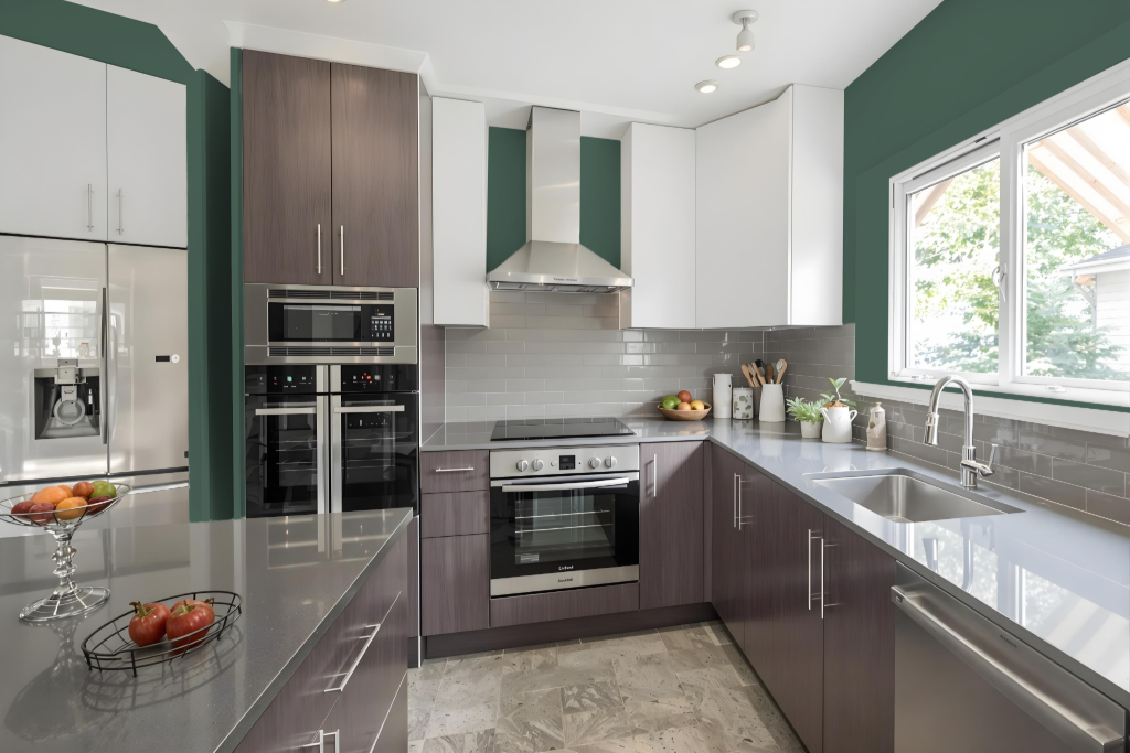 For a kitchen color scheme, Benjamin Moore's Lafayette Green HC-135 sets an inviting tone that pairs beautifully with crisp whites or soft creams to create timeless elegance. It harmonizes with natural wood finishes in cabinetry or flooring, while accents in burnt sienna or rust enhance the space’s warmth.