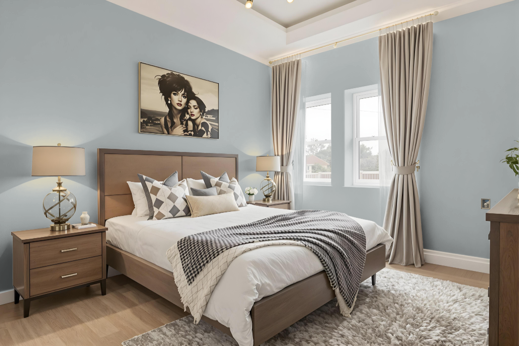 A bedroom color scheme featuring Benjamin Moore’s Marina Gray 1599 creates a serene environment. This hue works well with complementary tones like white, black, and various shades of blue, allowing design options that range from sleek modernity to traditional elegance.
