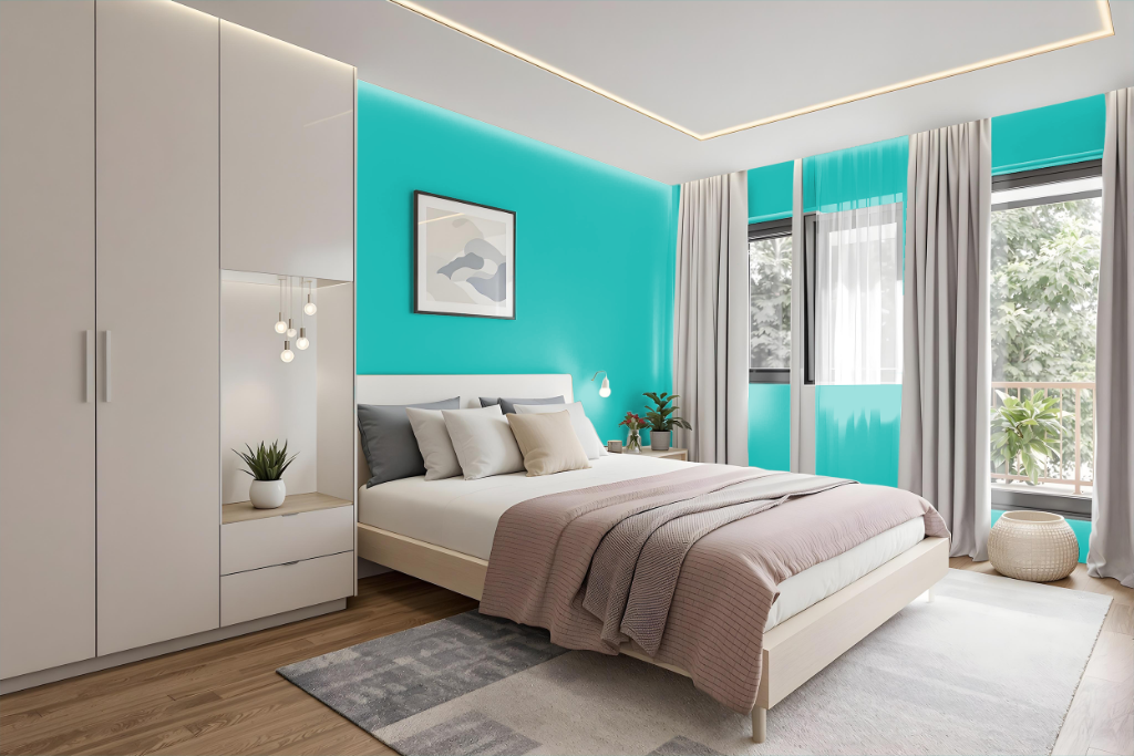 Beyond the living room, Poolside Blue uplifts bedrooms, home offices, creative studios, and bathrooms by infusing each space with an ambiance that encourages inspiration and tranquility. Its dynamic hue allows for creative pairing with complementary and monochromatic schemes, delivering a balanced visual appeal that adapts gracefully to different lighting conditions.