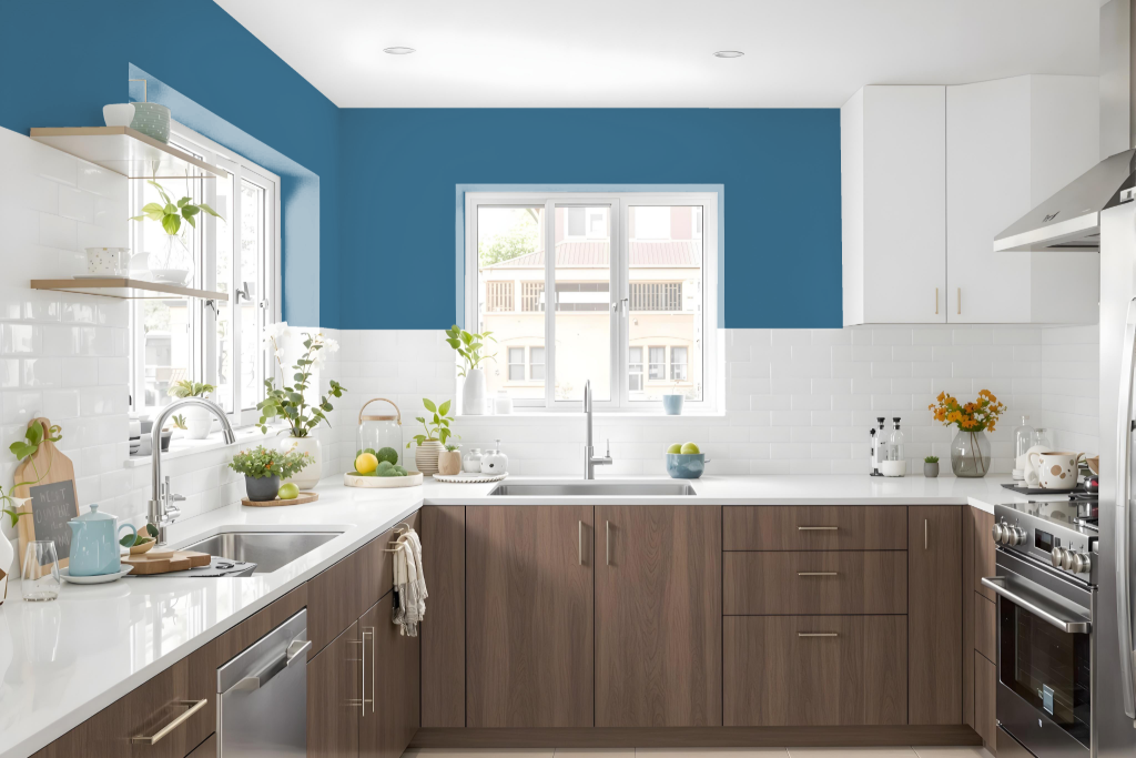 For a kitchen color scheme, Benjamin Moore Santa Monica Blue 776 creates a modern focal point that energizes the space. This hue can be applied as an accent wall or across the entire kitchen, establishing a stylish backdrop that pairs seamlessly with complementary tones like Distant Gray, Cloud Cover, and Wickham Gray to maintain a balanced look.