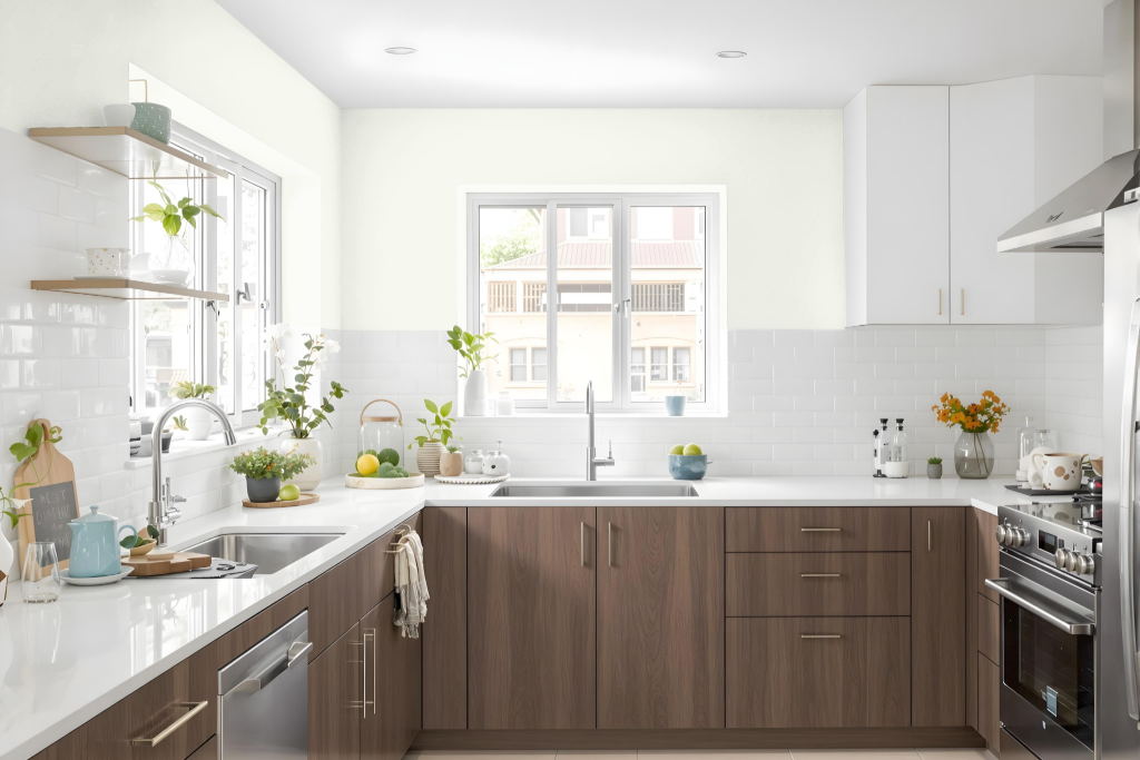 Benjamin Moore Snowfall White OC-118 is an effective kitchen color choice, especially in spaces with limited natural light where its yellow undertones brighten the room. This shade works well on walls, trim, and ceilings, and pairs seamlessly with crisp white subway backsplashes, countertops, and earth-toned accents like granite when complemented by darker cabinets.