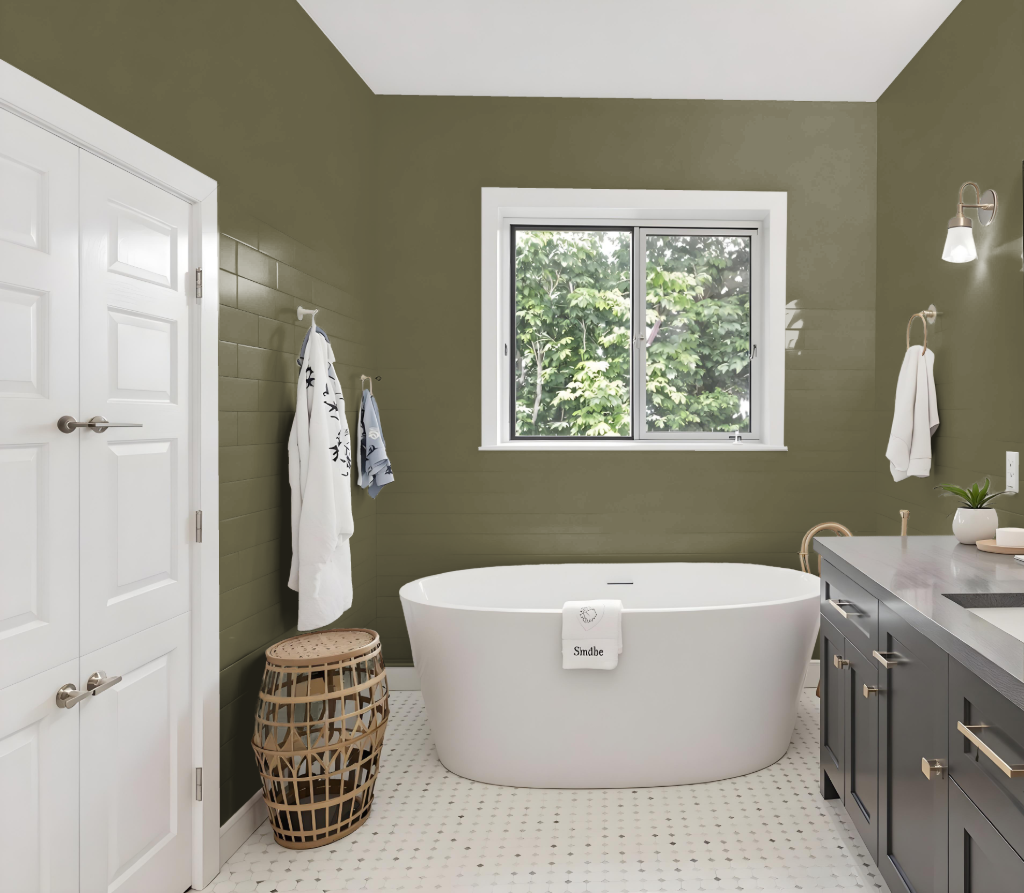 Complementing Turtle Green with other earthy shades such as Old Prairie or Croquet fosters a harmonious environment. This blend of natural tones adds depth and warmth, transforming the bathroom into a soothing retreat that balances relaxing simplicity with a touch of bold energy.