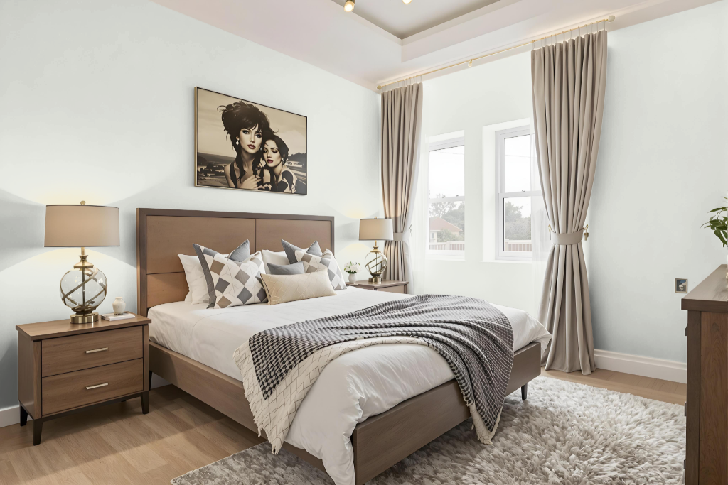 For a bedroom color scheme, Benjamin Moore White Wisp OC-54 offers a fresh and balanced canvas that harmonizes beautifully with contrasting tones. Its soft character makes it an excellent backdrop when paired with classic shades like Copley Gray for a refined, elegant feel, or with Wythe Blue to evoke a calm, coastal atmosphere.