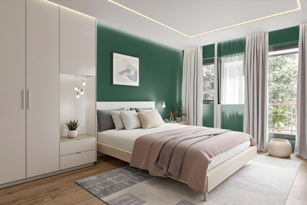 For a bedroom color scheme, Dulux Highland Green sets a sophisticated and moody atmosphere. It pairs beautifully with deep complementary hues to establish a rich, luxurious feel while balanced by lighter accents used for trim and detailing.