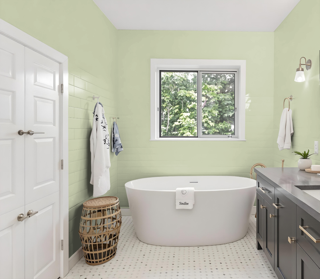Jotun Pistachio 7386 is an inviting bathroom color that brings warmth and a cozy touch to the space. Its light, warm tone creates an intimate ambiance ideal for larger areas, while a subtle yellow undertone infuses the room with a gentle, uplifting brightness.