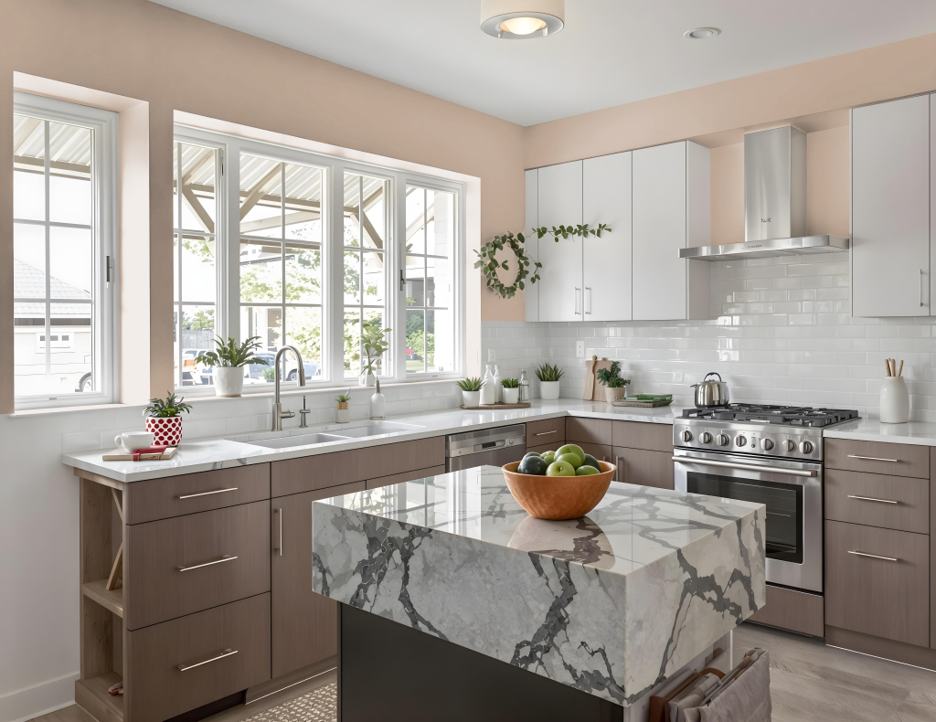 In addition, employing a monochromatic approach by varying the depth and intensity of Senses maintains a unified aesthetic, while light neutrals and soft grays reflect brightness to amplify the feeling of spaciousness. The incorporation of natural materials and earthy tones further contributes to a welcoming ambiance in the kitchen.