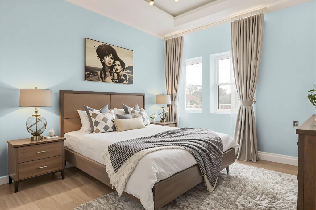 For a bedroom color scheme, Little Greene Bone China Blue - Faint sets the tone when paired with crisp white accents and warm natural wood tones, creating a classic and sophisticated look. This color is ideally suited for rooms with south or west-facing windows, where its cool undertones provide balance during warmer parts of the day, and can be enriched by touches of pale grey or lavender to emphasize its subtle beauty.
