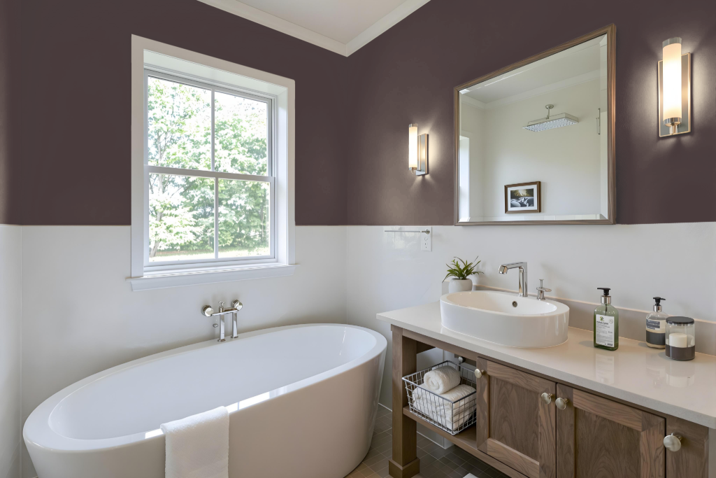 This color creates a dramatic and rich atmosphere, making it ideal for rooms where a bold, sophisticated look is desired. The aged wooden aubergine tone can add depth and character to any space, especially when paired with complementary and contrasting colors. It is particularly effective in creating a warm and inviting ambiance.
