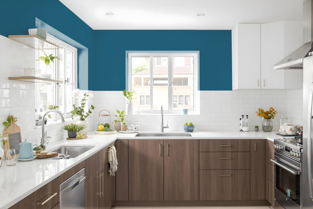 For a kitchen design, Azure Blue serves as a striking focal point that enhances modern atmospheres. When integrated with natural elements like a wooden backsplash, it creates a balanced blend of rustic charm and contemporary style.