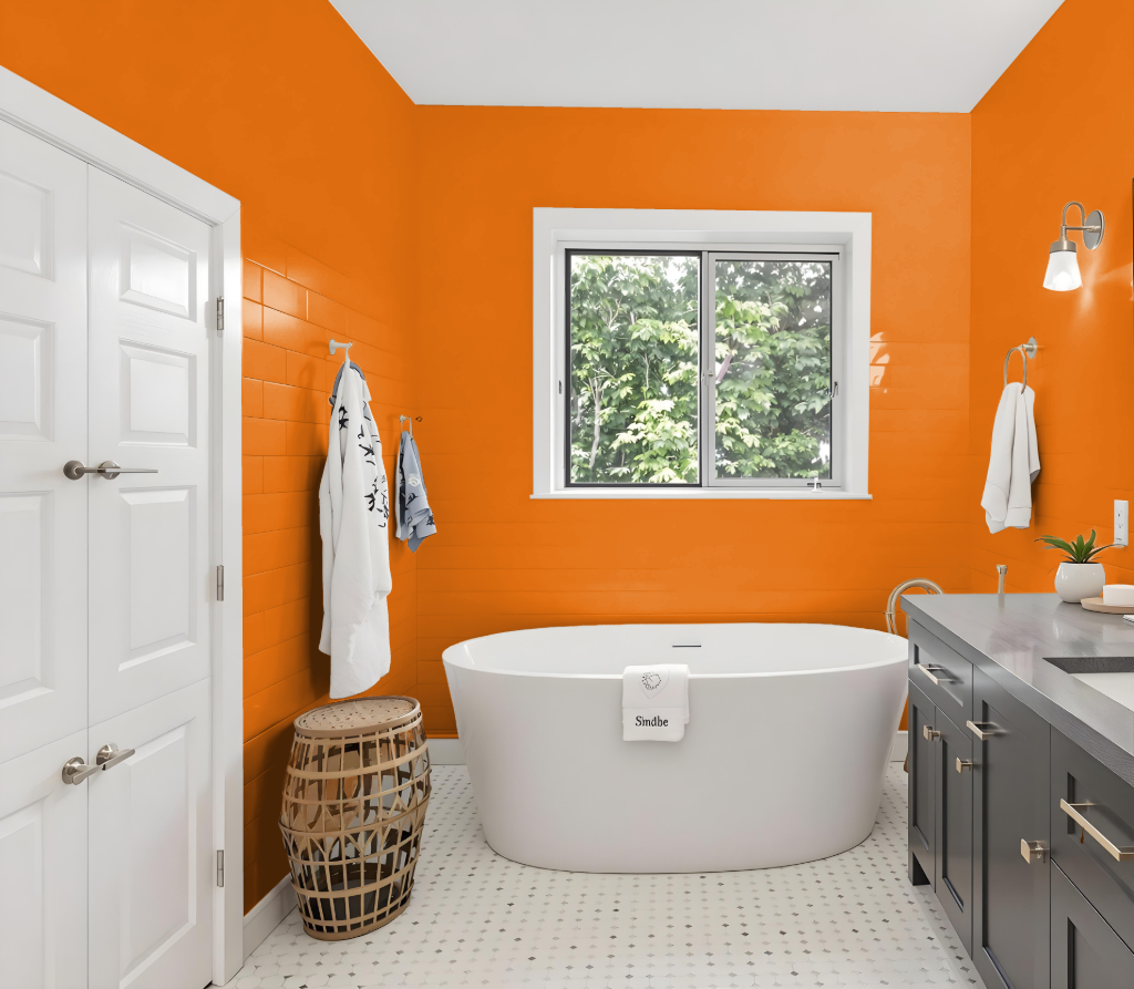 For a bathroom, RAL Classic Deep orange offers a bold and dynamic choice that makes an engaging accent wall, infusing the space with a vibrant and inviting atmosphere. It stands out brilliantly, yet it demands careful integration with the overall aesthetic and lighting, so pairing it with neutral hues on adjacent walls, fixtures, and furnishings is recommended to achieve a harmonious balance.