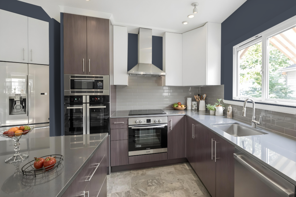 Pairing this distinctive shade with marble countertops and a white backsplash creates a harmonious, cohesive aesthetic. Incorporating lighter accents such as white walls, subtle countertops, and stainless steel appliances helps maintain a light, airy atmosphere, ensuring the space remains visually balanced and inviting.