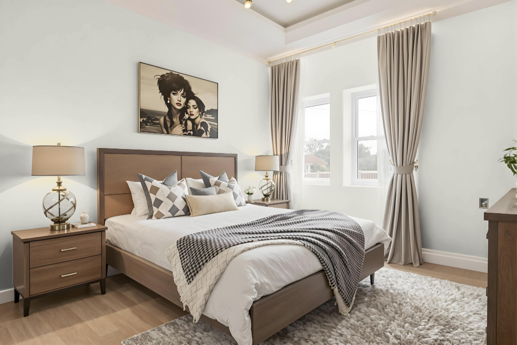 The bedroom color, RAL Effect RAL 110-2, offers a bright and airy feel that enhances the room’s spaciousness. Its high light reflectance value elevates the natural illumination, making the space feel more open and comfortable for relaxation.