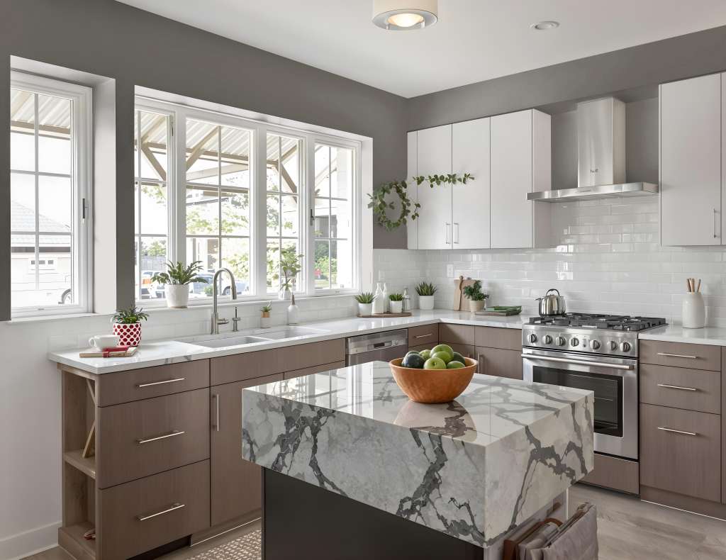 The color also enhances natural elements, complementing earthy tones like wood and stone. When used alongside lighter shades on cabinets or walls, it adds sophistication and ensures a refined, cohesive aesthetic throughout the kitchen.