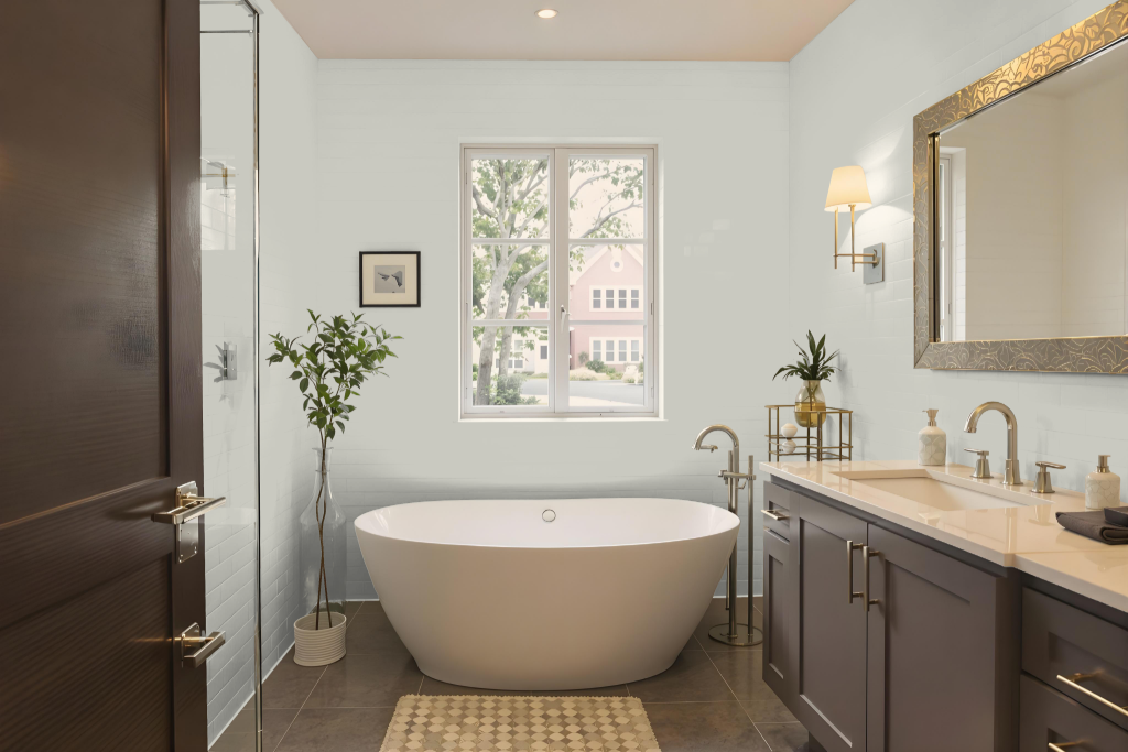 Its harmonious tone also works well with rich jewel tones and metallic finishes, adding a subtle touch of glamour without overwhelming the space. Testing the color in your bathroom's specific lighting conditions is recommended to achieve the best results.
