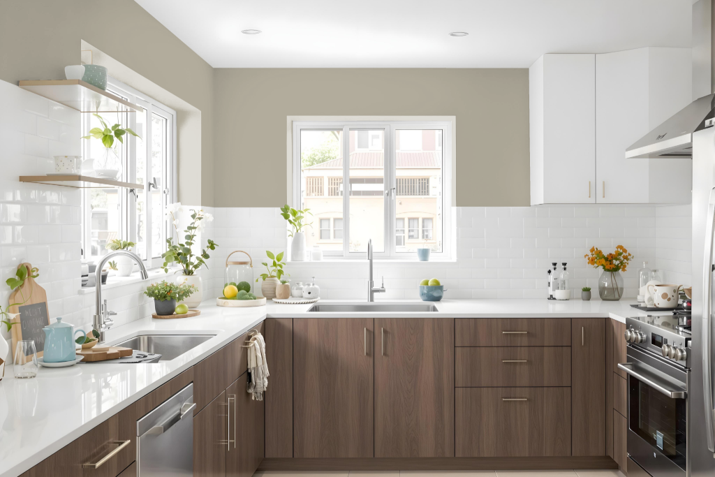 This hue complements neutral accents like wood-style tile and supports designs ranging from monochromatic to complementary palettes. Accents such as Sherwin Williams Sea Mariner or Starry Night add dynamic contrast, contributing to a stylish and cohesive kitchen environment.