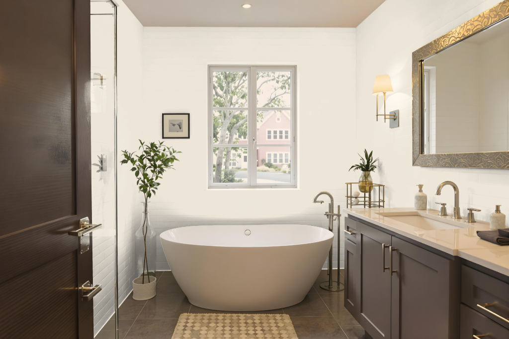In a bathroom, Sherwin-Williams Ivory Lace SW 7013 creates a calming atmosphere while offering a refined and balanced backdrop. Pairing this soothing shade with a bright white for trim produces a clean, traditional contrast, or pairing it with a richer, almost dramatic tone yields a striking interplay between light and dark elements.