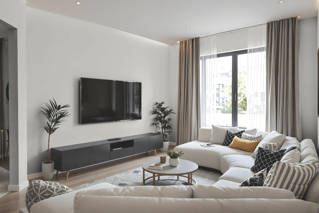 The color creates a clean, fresh, and neutral backdrop for any space. It can contribute to a light and bright feeling in well-lit areas or a moodier, darker appearance in spaces with limited natural light. It helps maintain a cohesive look across different rooms and lighting conditions, making the space feel warm and inviting.