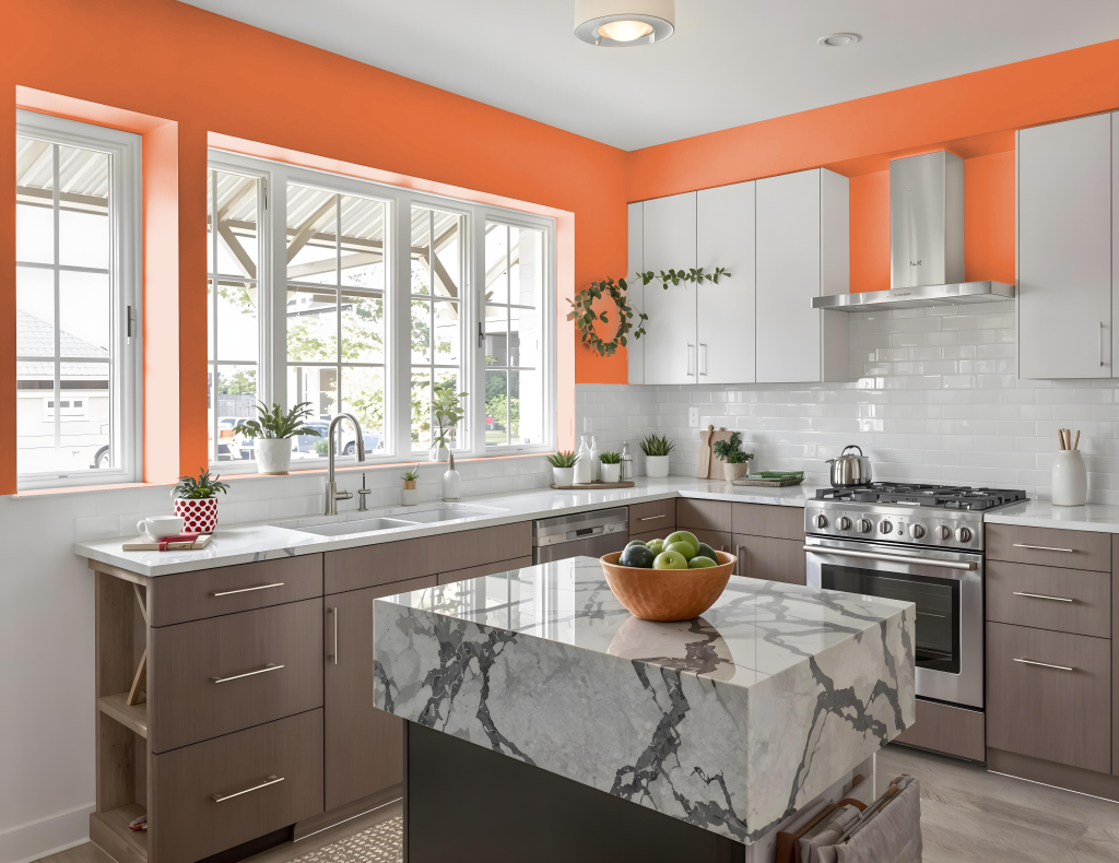 For a kitchen color scheme, Sherwin-Williams Knockout Orange SW 6885 can add a bold and inviting touch. The rich tone establishes a crisp, energetic backdrop when paired with neutral shades such as Alabaster, creating a striking contrast that brightens and modernizes the space. Accents of cool grays help to moderate the vibrancy, contributing to a balanced and clean aesthetic.