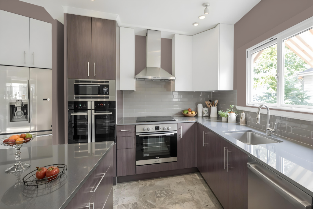 The rich hue works well when paired with wood and metal dining furniture, introducing sophistication and depth into the space. Thoughtfully mixing additional colors—from subtle pastels to bold jewel tones—can enhance the design further, such as by using the taupe on lower cabinetry while keeping upper cabinets in a bright, contrasting color, resulting in a unified and compelling kitchen aesthetic.