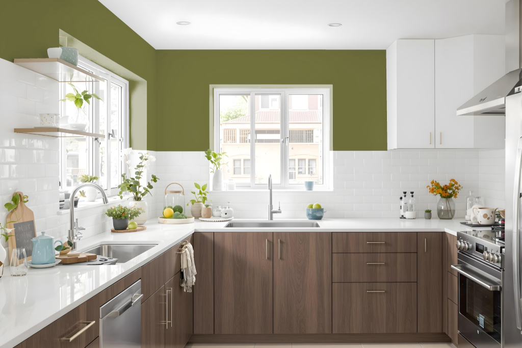 For a kitchen color scheme, Sherwin Williams Relentless Olive SW 6425 delivers an inviting style with its distinct tone. The color works beautifully as a choice for cabinets or accent walls, and it can provide a striking backdrop for kitchen islands and appliances when paired with warm neutrals like cream and taupe to establish a cozy atmosphere.