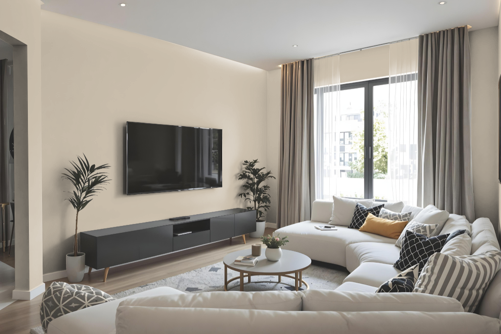 Complementing Sandbar with accent hues such as a deep, rich tone or a soft, sophisticated gray further enhances the overall design, while warm whites provide the perfect choice for trim. The paint also harmonizes beautifully with wood finishes that have warm, yellow undertones, allowing for a cohesive and inviting space.