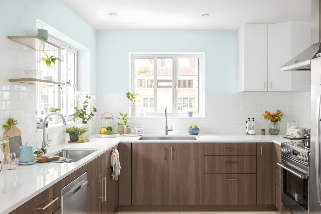 This carefully selected hue complements sophisticated features such as marble countertops, wood floors, and cabinetry while ensuring the space remains bright and fresh, even in areas with limited natural light. Its subtle presence contributes to a relaxed environment, perfect for kitchens focused on both style and tranquility.