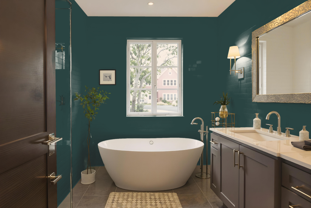 This thoughtful shade pairs seamlessly with a range of decor styles, including those featuring natural elements, and works harmoniously when complemented by brighter accents on ceilings and trims. Its enduring vibrancy in humid conditions further emphasizes its practicality for bathroom settings.